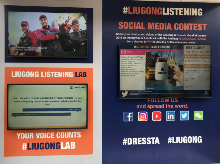 本屆展會上,觀眾在柳工展位的核心位置會看到一塊面積達(dá)24平方米的互動電子墻。無論是客戶還是觀眾可以將他們對柳工/銳斯塔產(chǎn)品或者服務(wù)的任何想法、建議或者意見發(fā)布在電子墻上。在每臺展示的新產(chǎn)品周邊,設(shè)置有供觀眾近距離參觀的走道。每臺設(shè)備的設(shè)計師和工程師將在現(xiàn)場向觀眾進(jìn)行講解并聆聽意見。同時,這些互動也將在展位的大屏幕和社交平臺上同步播放。柳工展臺設(shè)有專門的“交流中心”,收集大家對柳工下一代裝載機(jī)產(chǎn)品設(shè)計和制造的想法、期望。