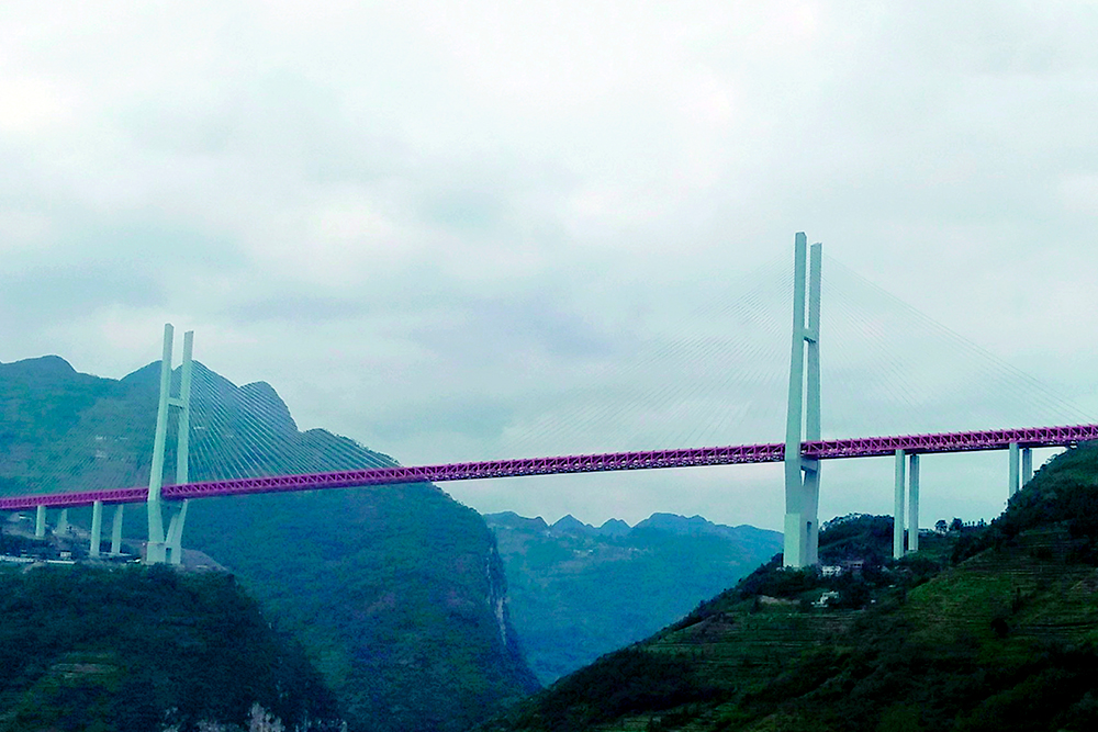貴州畢都高速北盤江特大橋,世界最高橋,垂直高度565米,相當(dāng)于200層樓高度,西南地區(qū)最大的項(xiàng)目之一。北盤江大橋采用全套的OVM250鋼絞線斜拉索體系。