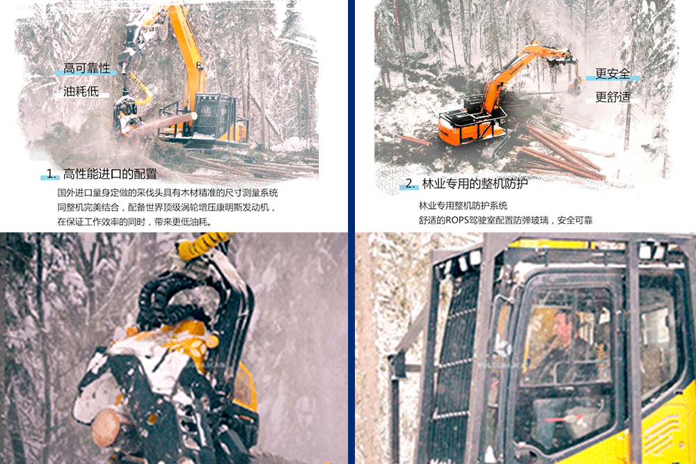國外進(jìn)口量身定做的采伐頭,完美的結(jié)構(gòu)設(shè)計(jì),快速喂料、高速切割,電腦數(shù)控、精準(zhǔn)定長(zhǎng)造材,易于維護(hù)和保養(yǎng),適應(yīng)各種大小的樹。