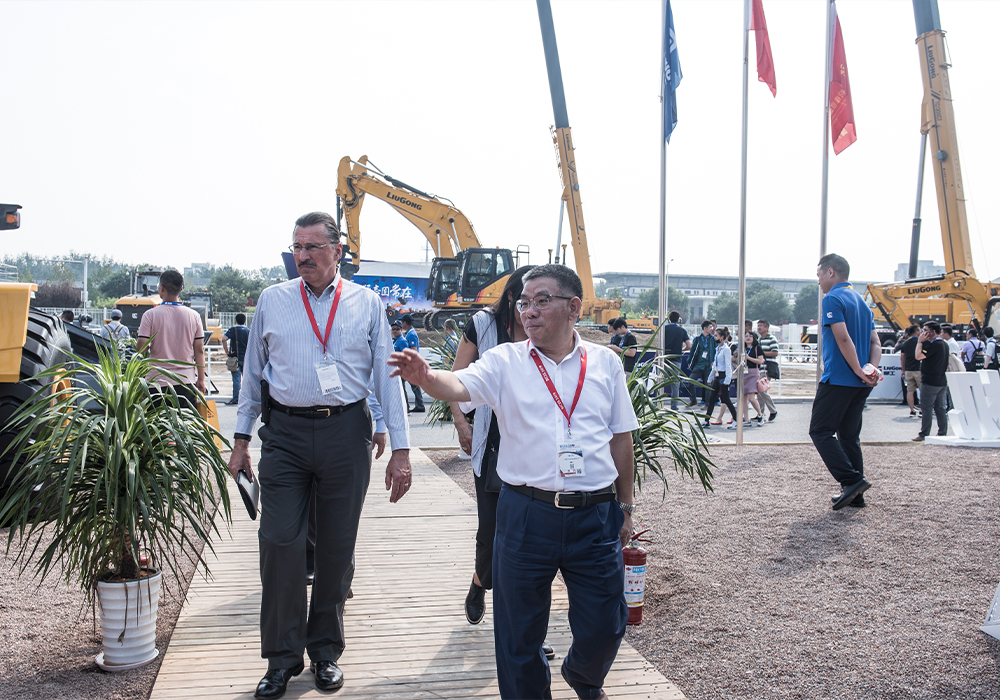 設備制造商協(xié)會(AEM)總裁Dennis J. Slater拜訪柳工展臺,與柳工董事長曾光安深入交流。