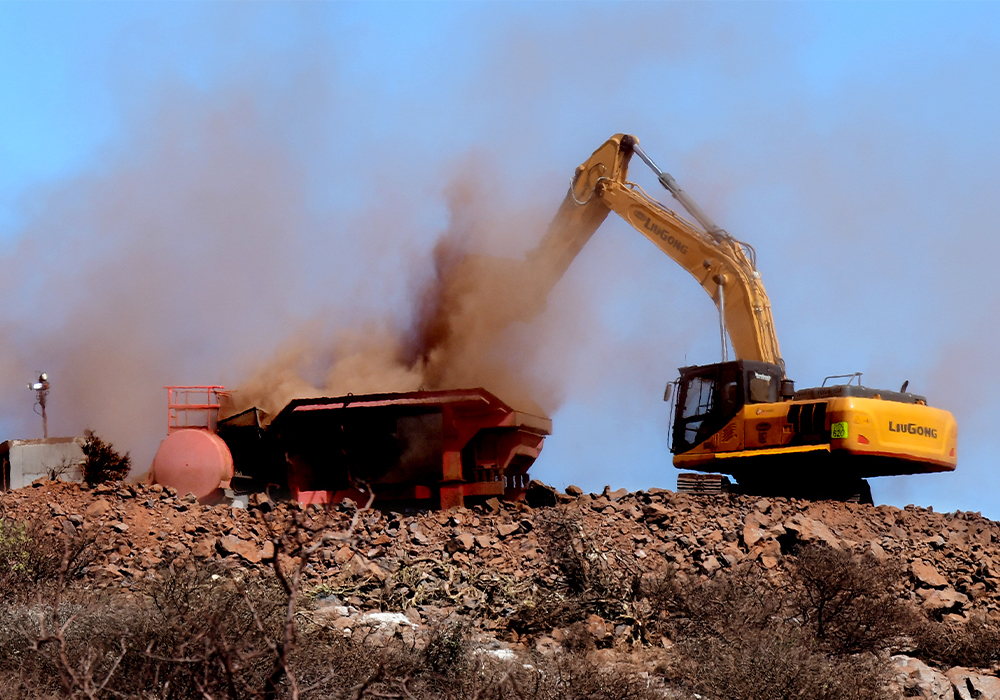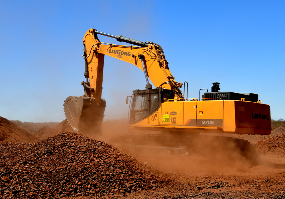 剛?cè)脲i礦基地,一大片褐紅色的錳礦呈現(xiàn)在我們的眼前。工地安全檢查程序嚴(yán)謹(jǐn),我們在穿戴了勞保防護(hù)用品,進(jìn)行了酒精測試后,開車到了柳工設(shè)備作業(yè)的現(xiàn)場。該客戶于去年采購了包括柳工裝載機(jī)、挖掘機(jī)、平地機(jī)和壓路機(jī)在內(nèi)的7臺柳工設(shè)備,這些設(shè)備分別遍布于工地的4個開采施工區(qū)域。我們首先到達(dá)的是柳工970E挖掘機(jī)的工作現(xiàn)場,在那里,我們看到970E挖掘機(jī)龐大而矯健的身姿,正在忙碌地挖掘錳礦石,接著倒入篩分設(shè)備里進(jìn)行篩分。一挖一倒,動作流暢連貫。